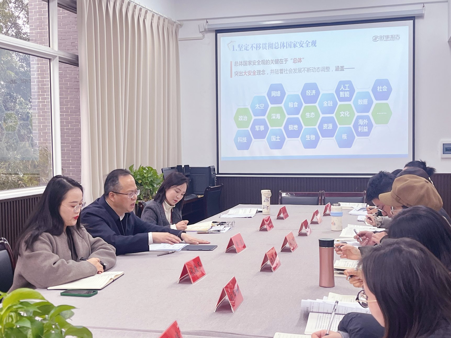 为深入推动党的二十届四中全会精神进课堂,切实提升《形势与政策》课的针对性与实效性,近日,形势与政策教研室在教学楼C301室召开本学期第7次集体备课会,校长翁波出席并进行指导。
