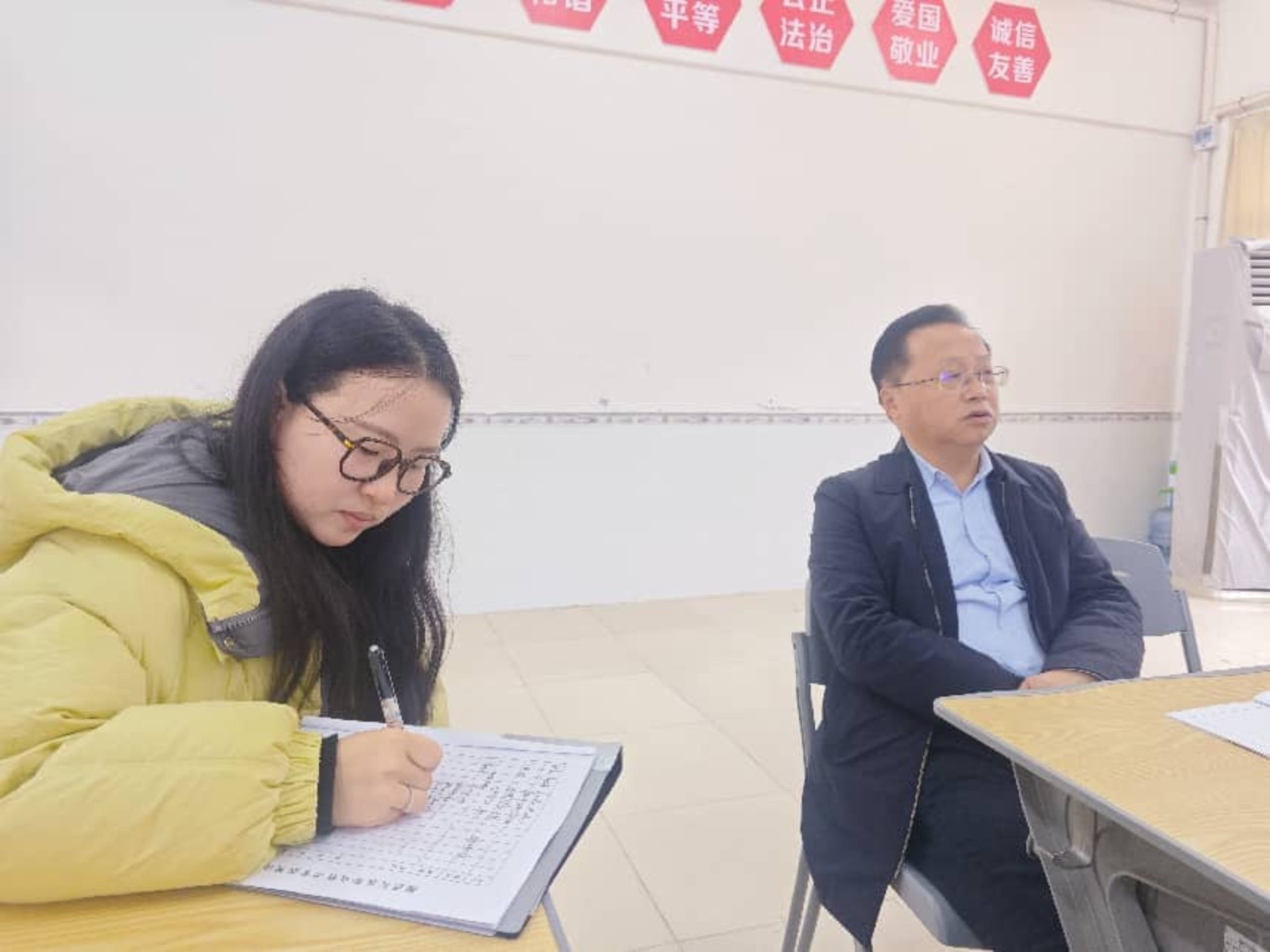 听课过程中,谢绍猛认真记录教学内容,仔细观察课堂互动情况,重点关注教学内容设计、学生参与度等环节。课后与授课教师、听课学生进行交流,对两位教师的教学准备、内容把握和课堂氛围营造给予了充分肯定,同时也对进一步提升思政课课堂教学质量提出了针对性指导意见。